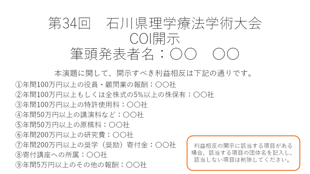 ・利益相反(COI)の有無に関わらず、その情報開示をお願いいたします。発表時の