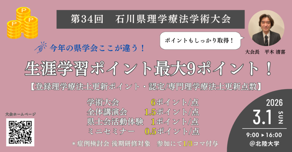 生涯学習ポイント最大9ポイント! お知らせ 2026.02.02 登録理学療法士更新ポイント・認定/専門理学療法士更新点数 学術大会 6ポイント/点全体講演会 1.5ポイント/点県士会活動体験 1ポイント/点ミニセミナー 0.5ポイント/点