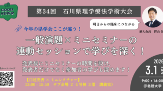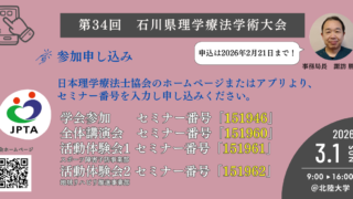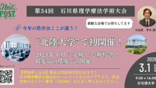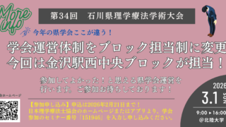 令和8年3月1日(日)に開催いたしました「第34回石川県理学療法学術大会」は、おかげさまをもちまして、無事に終了いたしました。 ご多忙中にもかかわらず、本学術大会にご参加いただきました皆様、出展を賜りました企業の皆様、会場を提供していただい...